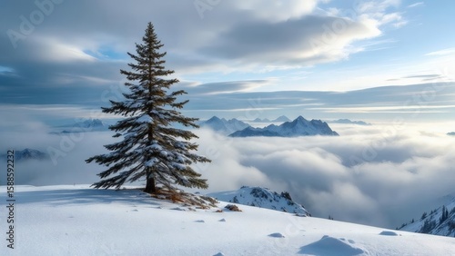 Fototapeta premium Majestic Snow Covered Pine Tree Above the Clouds in Winter Mountain