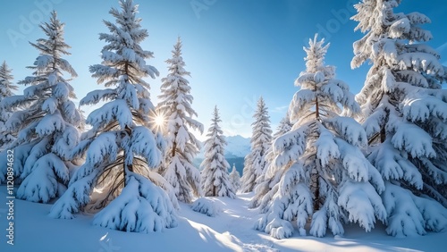 Naklejka premium Majestic Snow-Covered Pine Trees in Carpathian Mountains, Panoramic Winter Wonderland