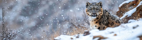 Obraz premium Majestic snow leopard cautiously traverses a snowy landscape, blending...