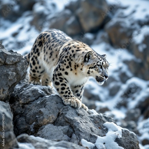 © frrlbt, Fototapeta premium Majestic snow leopard navigating rocky terrain