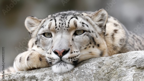Naklejka premium Majestic Snow Leopard Resting on Rocks - A serene snow leopard rests on a rocky outcrop, symbolizing peace, wild beauty, power, grace