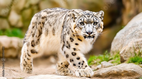 © Patchayanit , Obraz premium Majestic Snow Leopard Walking Confidently Through Rocky Terrain