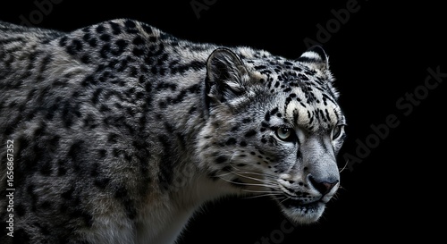 © SRRiadi, Obraz premium Majestic Snow Leopard Walking in Dark Background with Intense Focus and Sleek Fur