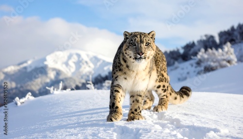Obraz premium Majestic snow leopard walking towards the viewer across a snow-covered mountain peak