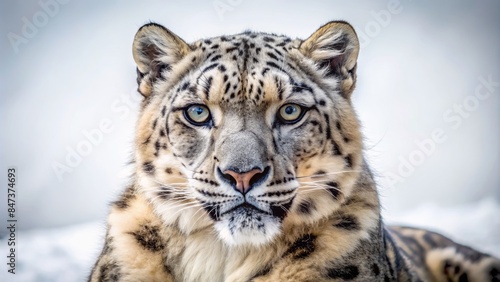 © Wanlop, Fototapeta premium Majestic snow leopard with piercing eyes and smoky fur posing regally on a crisp white background solo.