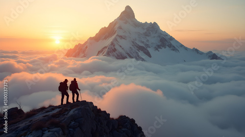 Fototapeta premium Majestic Snow Mountain Peak Golden Sunrise - Hikers Silhouetted Above Clouds...