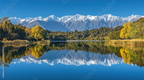 © Penatic Studio, Obraz premium Majestic Snowcapped Mountains Reflected In Calm Lake Water