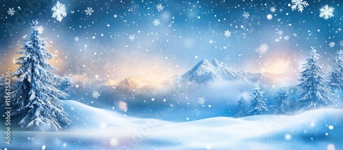 © The 2R Artificiality, Naklejka premium Majestic snowy mountain peak in a serene winter landscape surrounded by mist and falling snowflakes with ample space for text or content