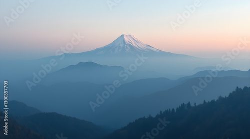 Fototapeta premium Majestic Snowy Mountain Peak in Hazy Blue Layered Landscape at Sunrise