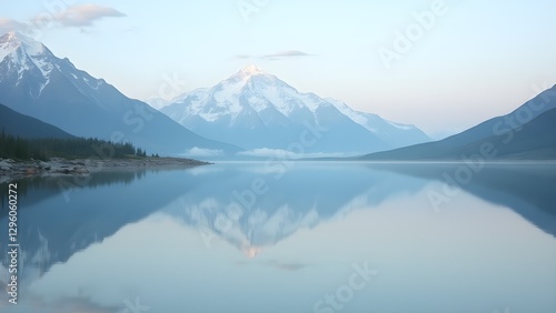 Naklejka premium Majestic Snowy Mountains Reflecting in a Calm Lake at Dawn - Panoramic Vista