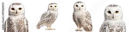 © R Studio, Fototapeta premium Majestic Snowy Owl Perched on Branch in Winter Forest Beautiful white and gray feathered owl with piercing eyes alert and observant sitting on a tree branch in a snowy wooded environment