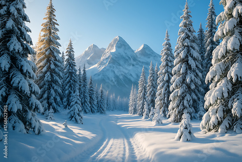 Fototapeta premium Majestic Snowy Pine Forest Road Leading Toward Sunlit Winter Mountains Under...