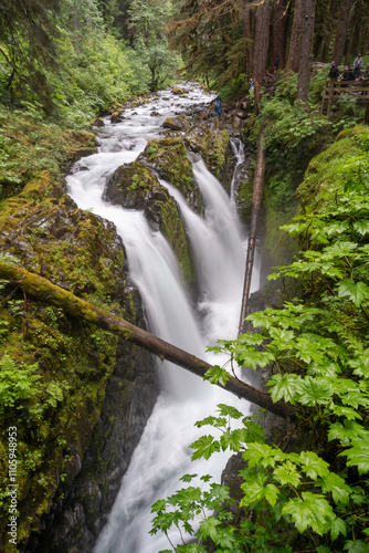 Naklejka premium Majestic Sol Duc Falls in Olympic National Park Amidst Lush Greenery.