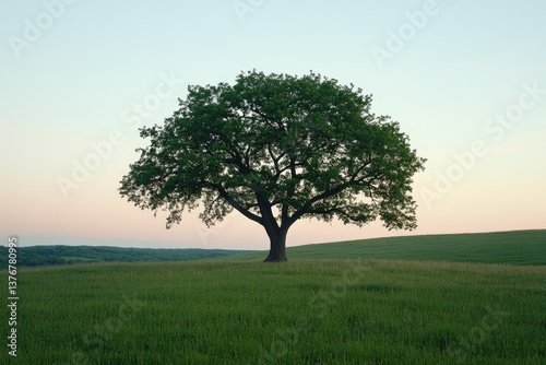 © VibrantLens, Obraz premium Majestic solitary tree in a serene green field under a pastel sky during sunset.