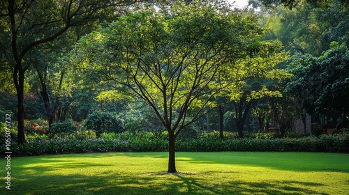 © Laongdaow Duangkaew, Fototapeta premium Majestic Solitary Tree with Dense Canopy Standing Tall in Sustainable Urban Garden Setting During Spring Season, Demonstrating Nature Conservation and Environmental Solutions