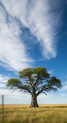 © lynkid1966, Obraz premium Majestic solitude of a solitary tree in a vast grassland under a blue sky