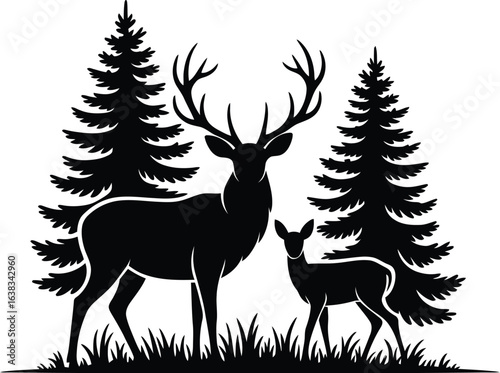 Obraz premium Majestic stag and fawn among pine trees deer forest
