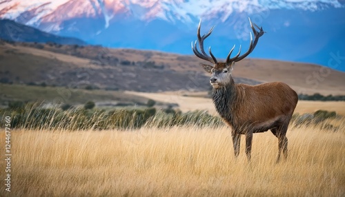 Fototapeta premium Majestic Stag Roaming in the Grazing Plains of Sierra Morena A Captivating...