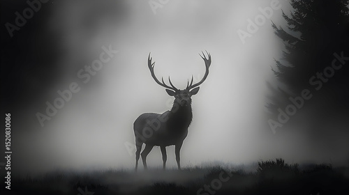 © PAIDI, Obraz premium Majestic stag silhouette in a misty landscape.