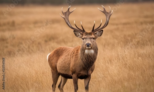Fototapeta premium Majestic Stag Standing Tall in Golden Meadow, Capturing the Essence of...