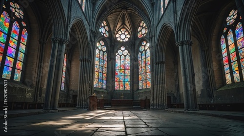 Fototapeta premium Majestic stained glass windows illuminate historic cathedral interior during...
