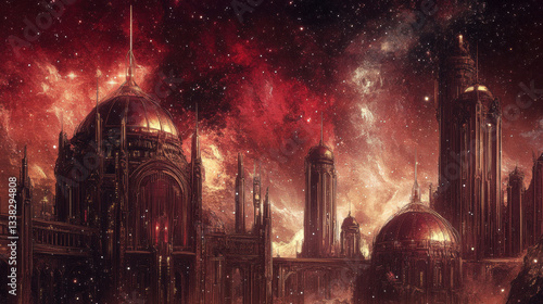 © mankong, Naklejka premium majestic starlit observatory stands against cosmic backdrop, with intricate domes and towers illuminated by celestial glow, evoking sense of wonder and exploration