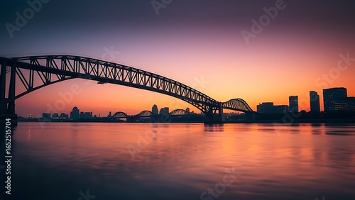 Fototapeta premium Majestic steel bridge at dusk reflects golden light on calm water under a...