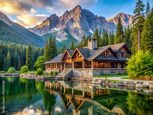 © Sirinporn, Fototapeta premium Majestic stone and wood visitor center nestled among ancient trees, surrounded by lush greenery, overlooking calm