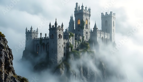© Morits Art, Fototapeta premium Majestic Stone Castle Enveloped In Fog Misty Mountaintop Scene