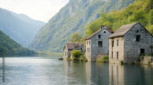 Fototapeta premium Majestic Stone Houses by the Serene Lake