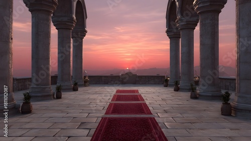 Obraz premium Majestic stone terrace with red carpet leading to a vibrant sunset over the...