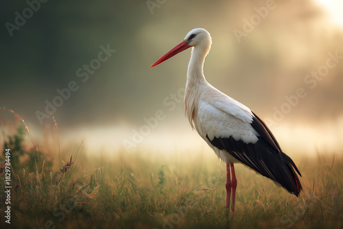 Obraz premium Majestic stork standing in a sunlit meadow with soft morning mist