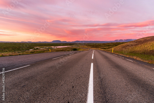 © alpegor, Fototapeta premium Majestic summer sunset over a winding mountain road leading down to a valley. Myvatn, Iceland.