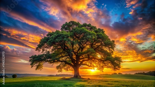 Obraz premium Majestic Sunrise Oak Tree Photography: Golden Hour Landscape, Deep Depth of Field, High Resolution Image