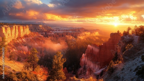 Fototapeta premium Majestic Sunrise over a Canyon. A breathtaking panorama of a canyon at sunrise. Vibrant colors paint the sky and rock formations. Misty mountaintops add a touch of ethereal beauty