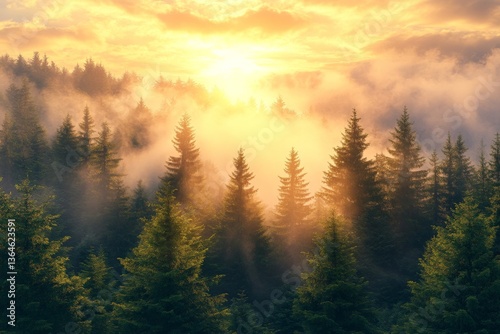 Naklejka premium Majestic sunrise over a misty forest landscape with dense pine trees and...