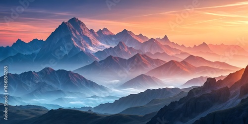 © Natsumae, Obraz premium Majestic Sunrise Over Layered Mountains,APanoramic View Of Serene Beauty And Tranquil Atmosphere In Nature.Breathtaking Colors At Dawn