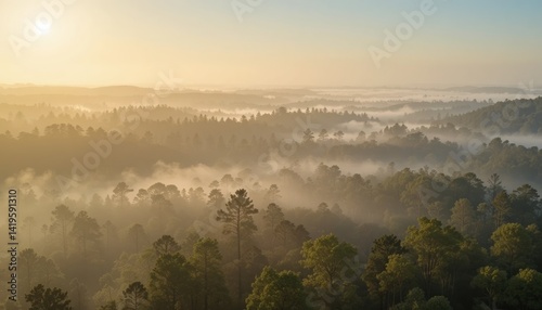 Fototapeta premium Majestic sunrise over misty forest landscape nature exploration aerial view tranquil environment serenity and beauty