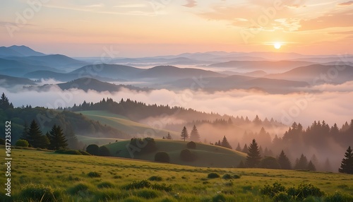 Fototapeta premium Majestic Sunrise Over Misty Mountain Ranges and Rolling Green Hills