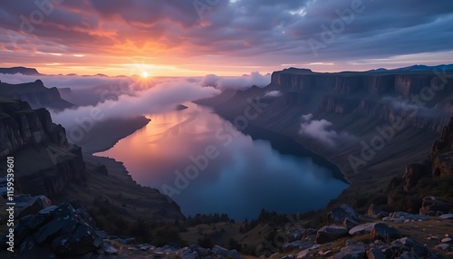 © jakiyo, Fototapeta premium Majestic Sunrise Over Mountain Lake And Cliffs
