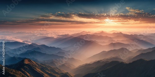 Naklejka premium Majestic Sunrise Over Mountain Range with Golden Rays and Breathtaking Panorama