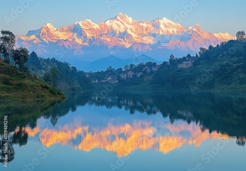 Fototapeta premium Majestic Sunrise Over Serene Lake Reflecting Snow-Capped Mountains and Lush Greenery in Peaceful Himalayan Landscape