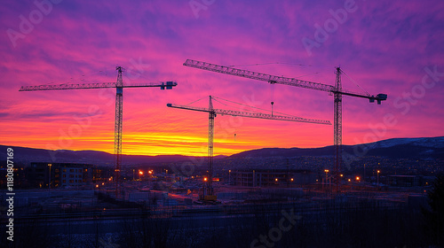 © O, Obraz premium Majestic sunrise with construction cranes silhouetted against vibrant sky
