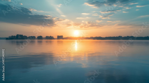 Fototapeta premium Majestic sunrise with golden light reflected on the serene surface of water