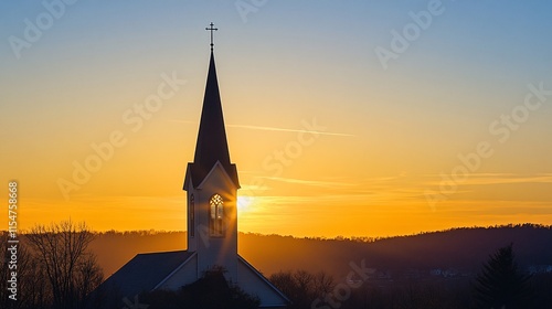 Obraz premium Majestic Sunset Behind a Church Steeple with Clear Sky and Trees