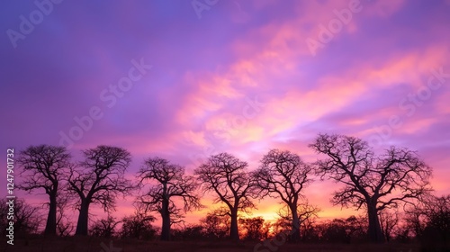 © Jakkarin, Fototapeta premium Majestic Sunset Behind a Row of Silhouetted Baobab Trees