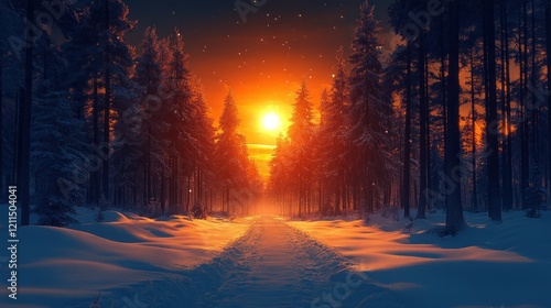 © novitasary, Naklejka premium Majestic Sunset in a Snowy Forest Path