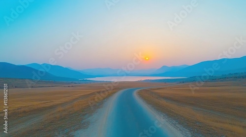 Fototapeta premium Majestic Sunset Landscape Over Serene Lake with Rolling Hills and Road