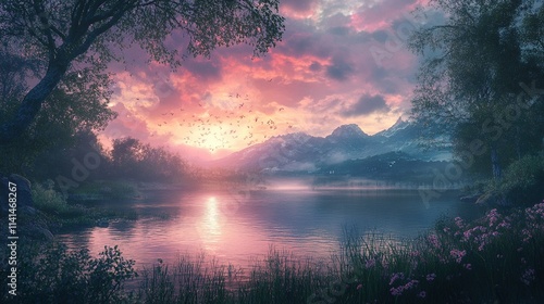 © Infinity, Obraz premium Majestic Sunset Landscape: Serene Lake and Mountains