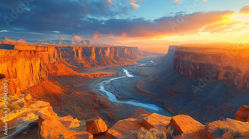 © Sadia, Fototapeta premium Majestic sunset over a canyon with winding river in a vast desert landscape